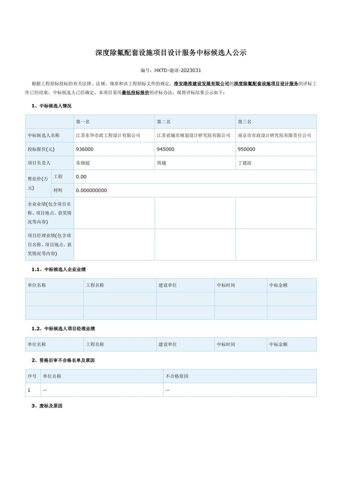 深度除氟配套設施項目設計服務(wù)中標候選人公示